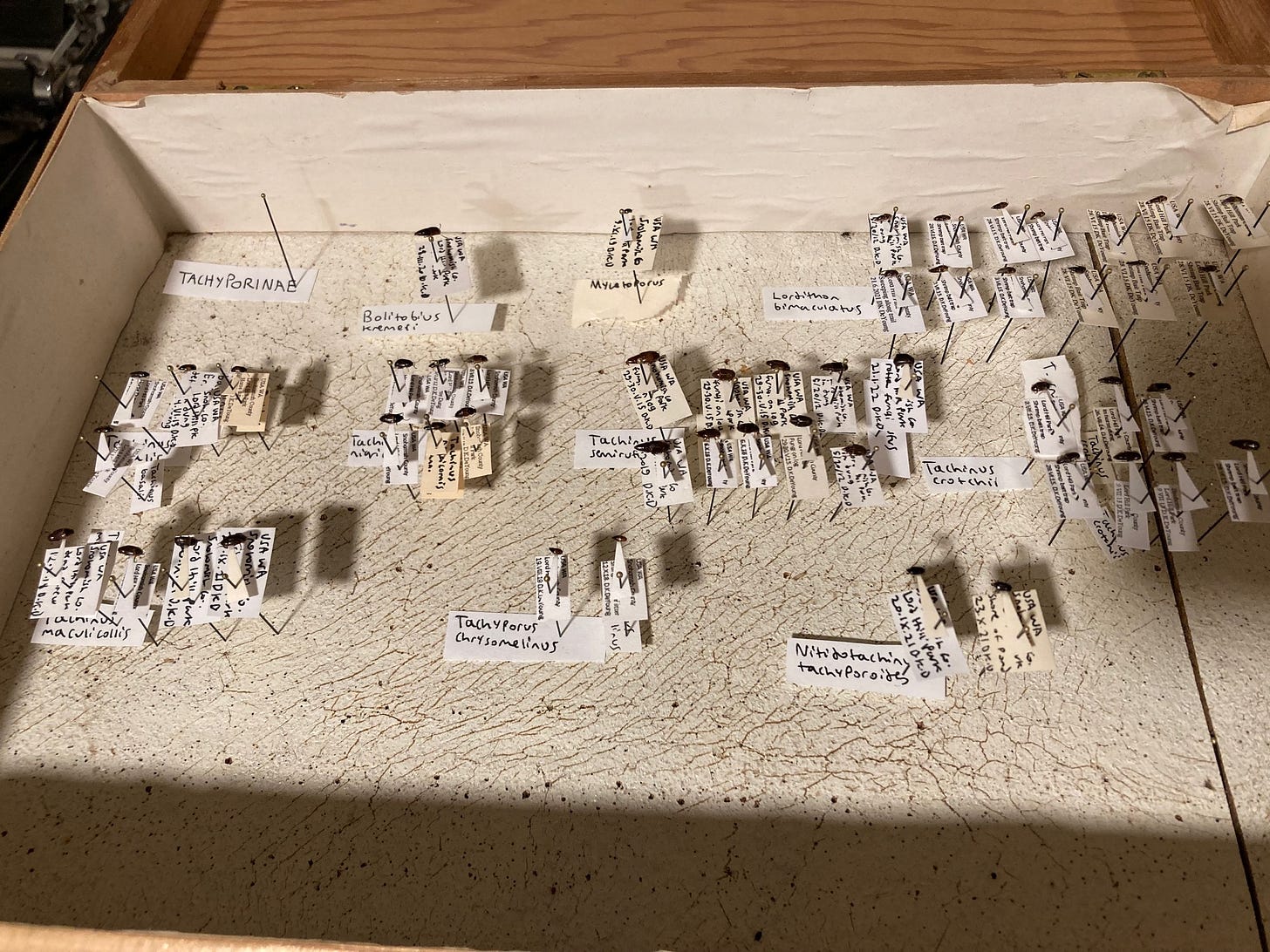 Finally, there is a personal connection here: through an odd concatenation of circumstances, as Jeeves would say, a number of years ago I acquired several of Professor Hatch’s fine old handmade insect boxes. Here is a photo of one, a bit worn with the steady accumulation of time, containing a few specimens from my own collection.