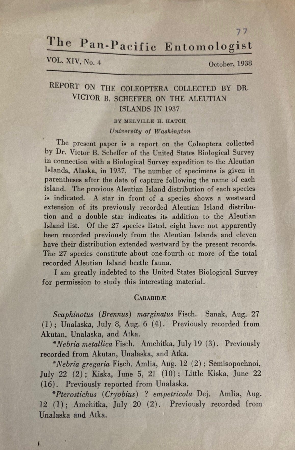 Of note to those who are familiar with science papers: Hatch notes ‘ of the 27 species listed, eight have not apparently been recorded previously from the Aleutian Islands…’ . Notice that he says ‘apparently’- a perfectly acceptable word at the time. It was alright to admit that one didn’t know everything, a humility which is rarely found today.